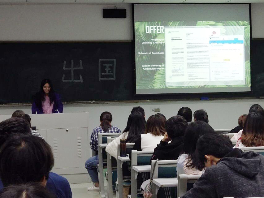 接着高戈凡、彭靖雯、高远之同学结合自身的经历和同学们分享了他们对我校各种出国方式的看法,总结了不同国家出国的总费用,各学校的成绩要求等;最后,左昕怡同学细致地讲解了如何去申请学校的一些细节,叮嘱同学现在要好好学习外语。