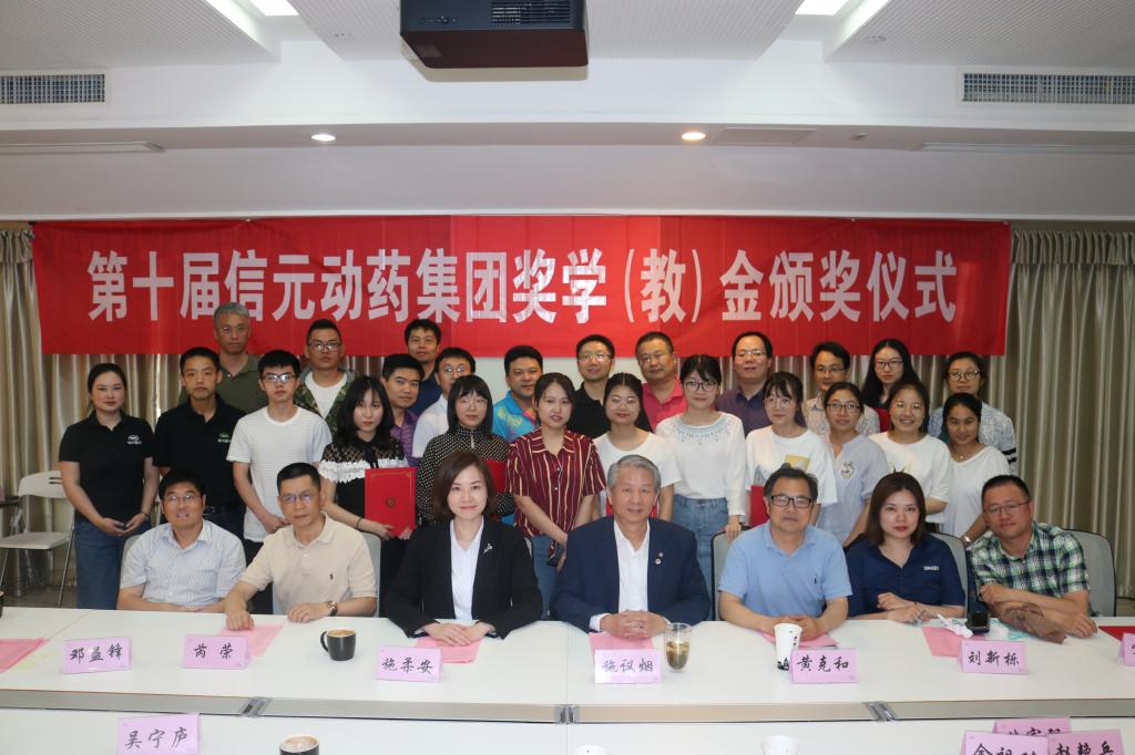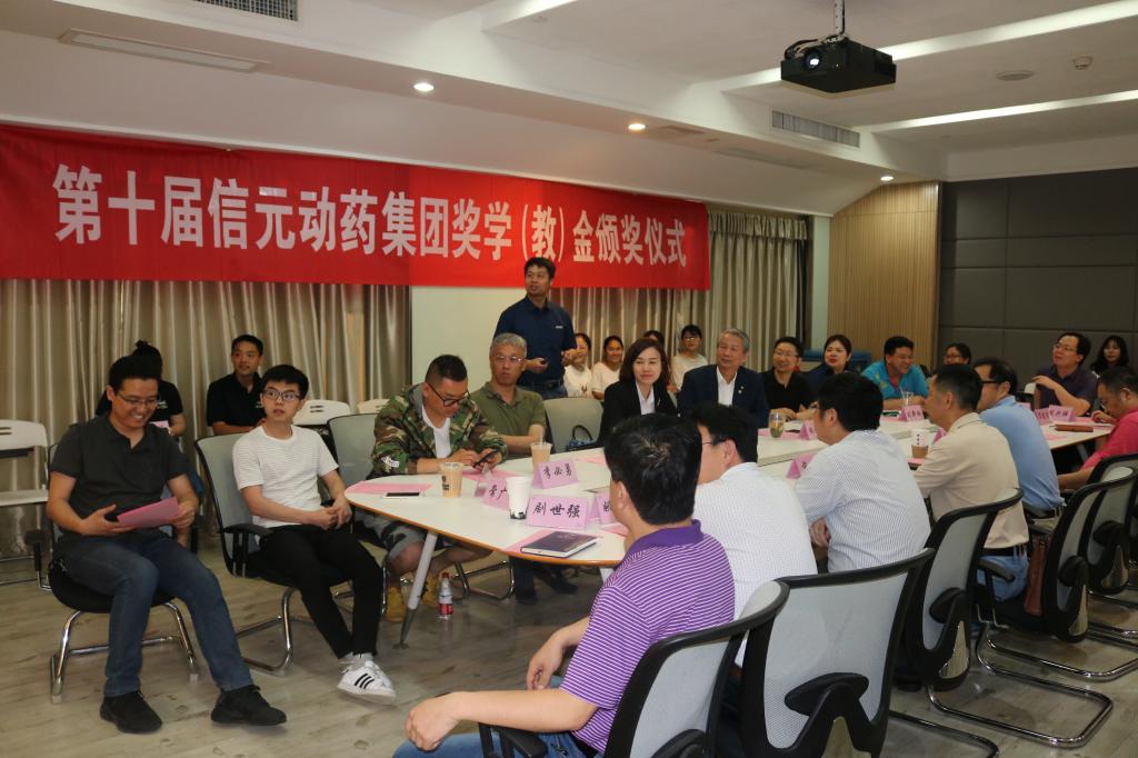 仪式开始后,首先由郑浩先生介绍了信元动药集团的历史文化,再由董事长施议烟先生发言、宣读获奖决定并为获奖教师颁奖,接着由施柔安女士和刘新栎女士为获奖学生颁奖。
