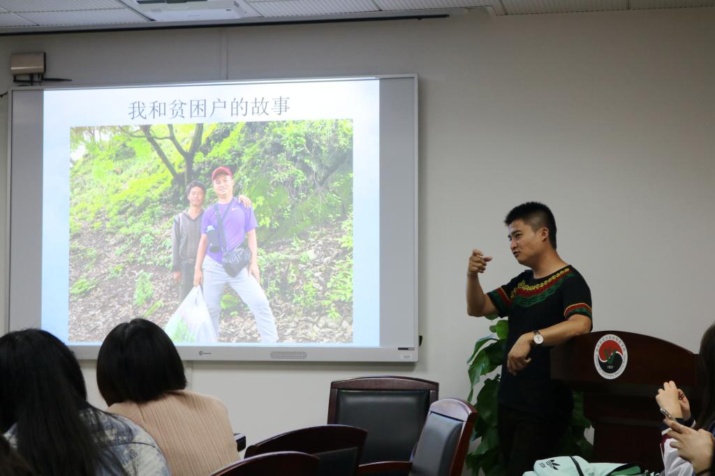 汪杨力所在的马鹿寨彝族村位于攀枝花市米易县,自然风景秀美,具有高山草甸、蛮王洞等丰富的旅游资源,但基础设施差,尤其是交通,经常出现塌方和坠石,有些地段甚至只能通过一辆摩托车。为进一步带动村民脱贫致富,获取村民的信任和支持,打开工作局面,汪杨力克服多重困难,组织开展马鹿寨2018年彝族火把节文艺晚会,丰富村民的文化精神生活;组织家政服务培训班,提高村民求职就业能力;大力发展旅游业,成立合作社,村民入股,共享产业发展的成果。汪杨力表示:“扶贫一线工作中,困难很多,但现在党和国家政策好,一心一意为人民办实事,百姓是否有房住,小孩是否有学上,都是政府工作的重点,除了经济上脱贫,我们还要保证农民在思想上也脱贫。现在全党上下都在积极组织开展“不忘初心、牢记使命”主题教育,对于在座的学弟学妹们来说,初心就是“好好学习专业知识,多参加学生工作、社会实践,提高自己的责任心,做好自己该做的事情”,步入社会后,才能回报母校、回报社会。”