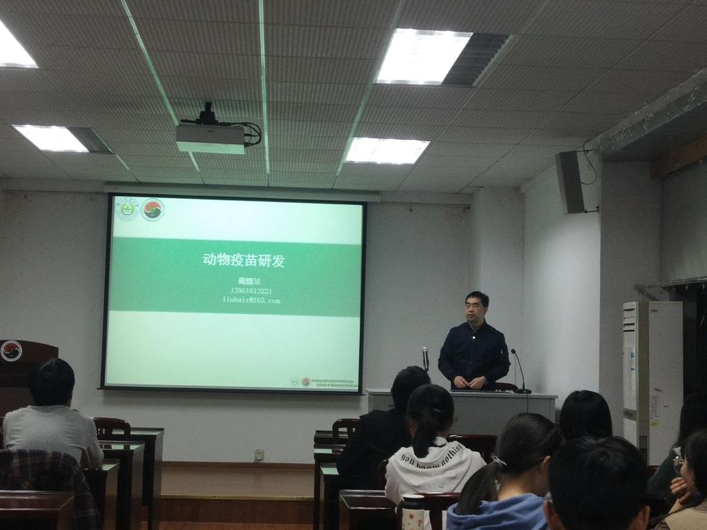 首先,蔺辉星老师向我们介绍了动物疫苗的概念与起源以及分类,让同学们初步认识了动物疫苗。然后,老师向同学们介绍了目前国内疫苗的研发现状,包括相关法规,一些国内外疫苗公司以及近期获批产品。接着,老师向同学们介绍了疫苗研制与生产的步骤及要求,还为同学们介绍了动物疫苗的发展趋势。老师讲得十分详细,同学们也都听得非常认真。