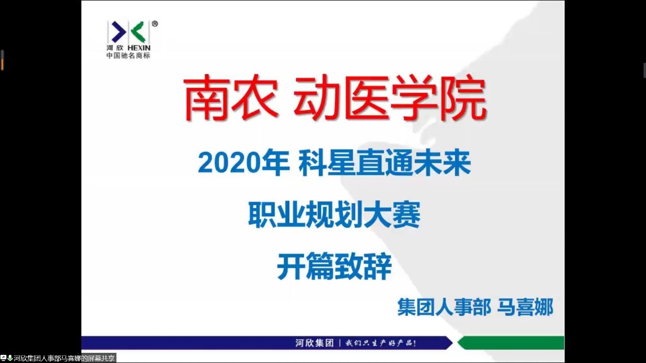 5月15日,新葡的京官网外联与生涯促进部与学习部通过腾讯会议平台成功举行了由河北科星药业有限公司赞助的动医院第二届“科星直通未来”生涯规划大赛。本次活动有幸邀请到河欣集团人事部经理马喜娜,科星药业企划部总监梁志刚,农学院团委书记王彬,园艺学院团委副书记夏丽,食品科技学院团委副书记陈宏强以及本院团委书记金洁南六人为我们的选手点评。