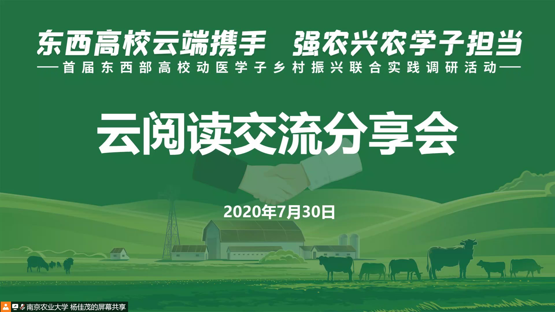 8月18日晚7:00,由新葡的京集团8814发起,联合东西部七所涉农高校共同开展的“东西部高校云端携手,强农兴农学子担当”首届东西部高校动医学子乡村振兴联合实践调研活动,进行了“云阅读计划”读书分享会。