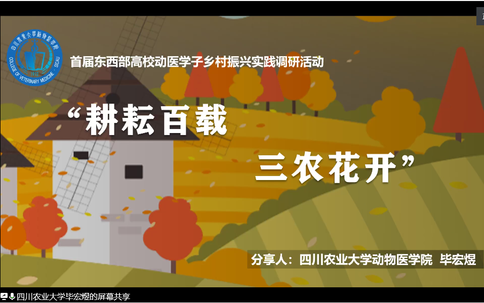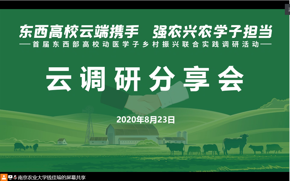 8月23日上午九点,“东西高校云端携手 强农兴农学子担当”首届东西部高校动医学子乡村振兴联合实践调研活动,进行了云调研分享会。至此,此次由新葡的京集团8814牵头,联合七所涉农高校的暑期实践调研活动圆满结束。
