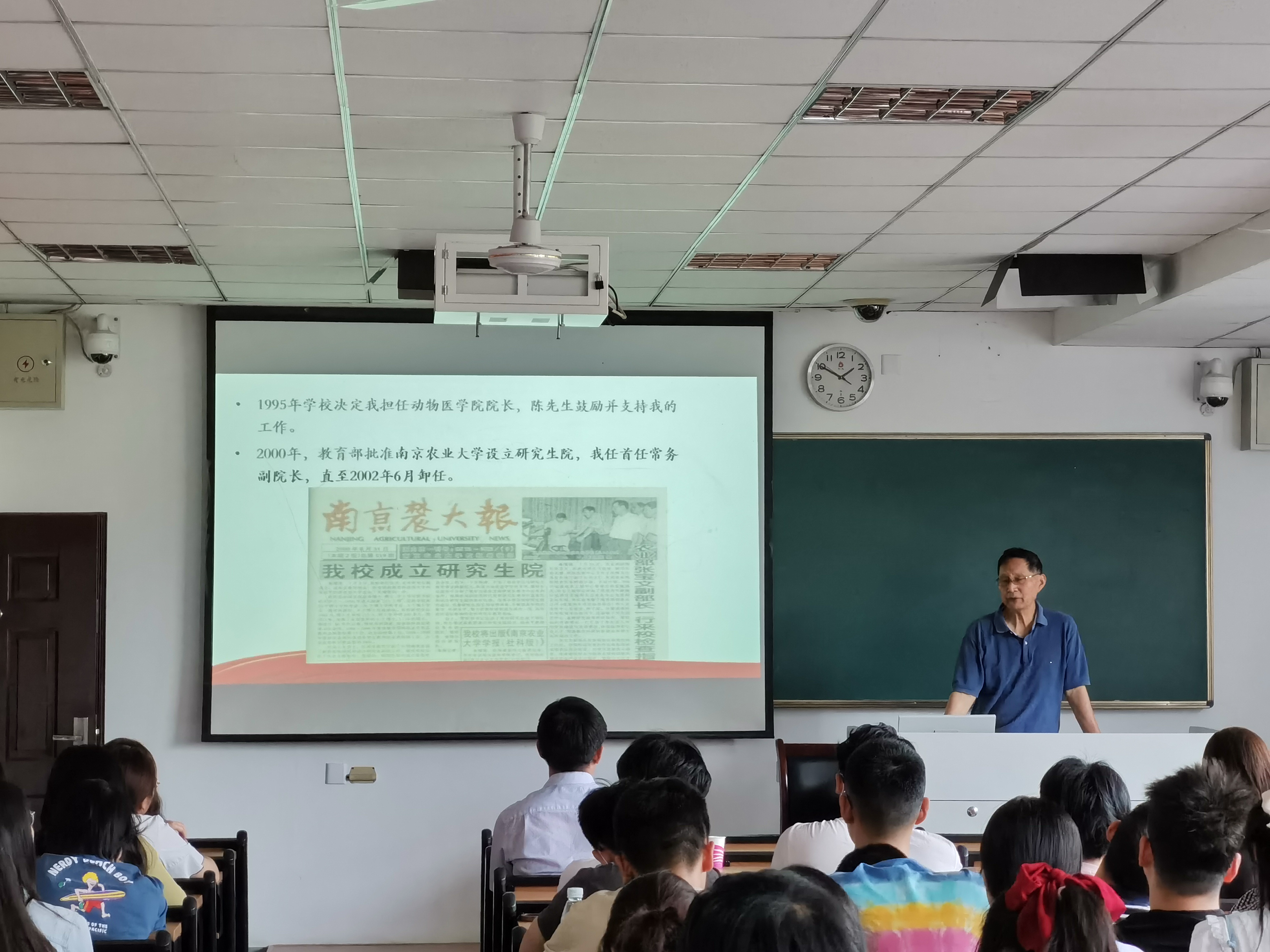 苗老师以研究生管理的重要性做了开场,向我们介绍了陆老师在兽医学科的权威性,前沿性和重大贡献。陆老师以“功成身退 高风垂范——忆陈万芳先生”为题,以自己和导师之间的故事,向我们传达了南农薪火不断,一脉相承的优良学风。前辈的卓越贡献,造就了如今的南农动医。讲座最后,陆老师以一句“这世界对追求理想的人并不沉默”赠予在座的各位新生,对南农动医的未来寄予厚望。