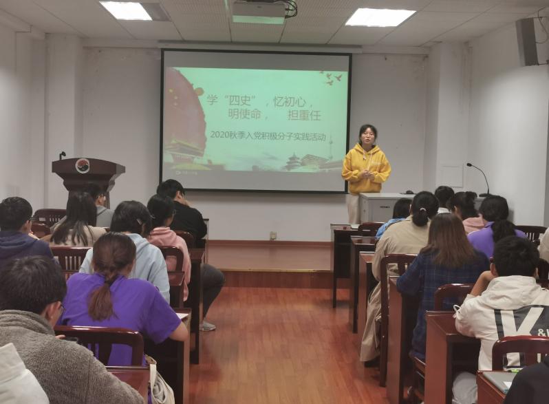 11月1日晚6:00,新葡的京官网在逸夫楼3044会议室举行了以“学四史,忆初心,明使命,担重任。”为主题的2020年秋季入党积极分子实践活动,积极分子们积极主动参与了本次实践活动,收获颇丰。