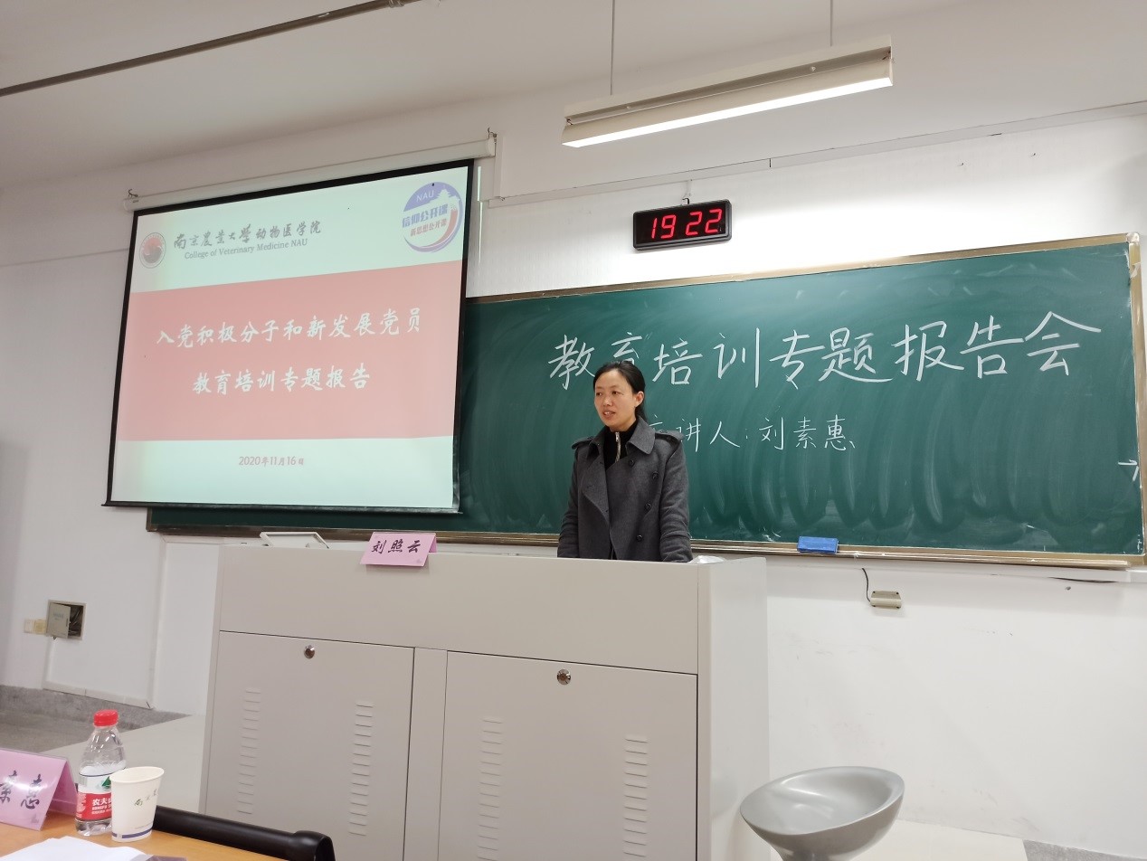 11月16日下午6:30,新葡的京官网在教四楼B202举行了入党积极分子和新发展党员教育培训专题报告,主讲人为动物科技学院学生工作办公室主任、团委书记、本科生第一党支部书记刘素惠。报告由新葡的京集团8814党委副书记刘照云主持,新葡的京集团8814全体新发展党员和入党积极分子到场参会。