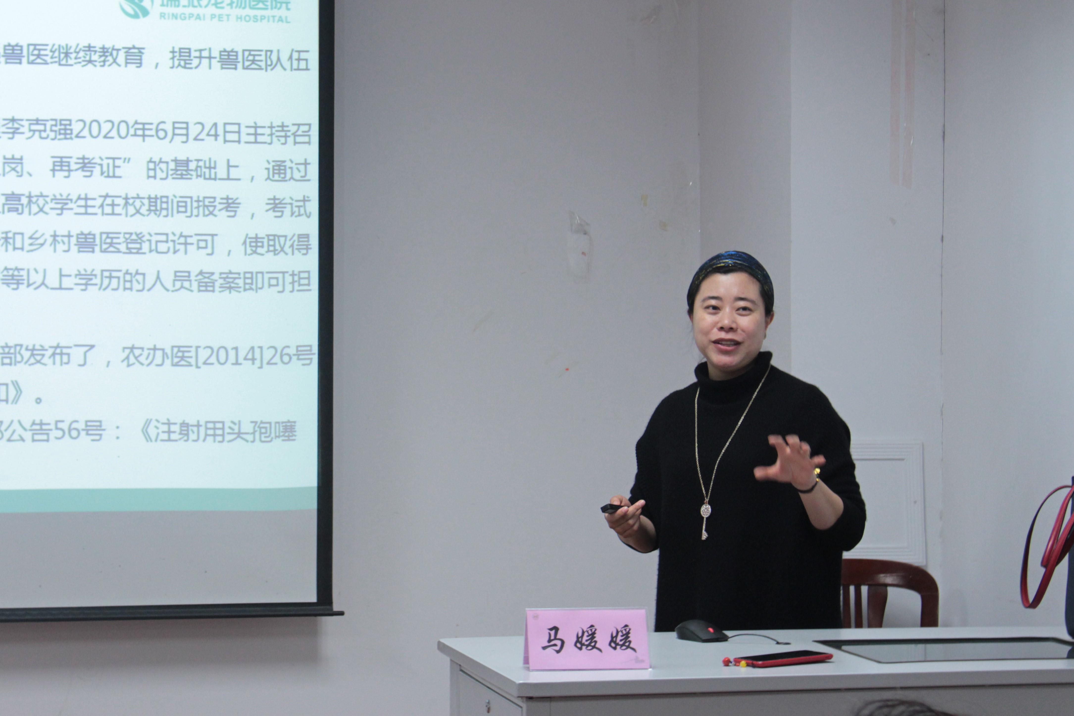 马媛媛经理作为本次培训的主讲人,首先对自身的学习和工作经历进行了总结,然后对本次宠物医院模拟运营大赛的流程进行了简短的介绍。本次比赛分为两个阶段:初赛为书面材料的评比,复赛为现场竞技形式。