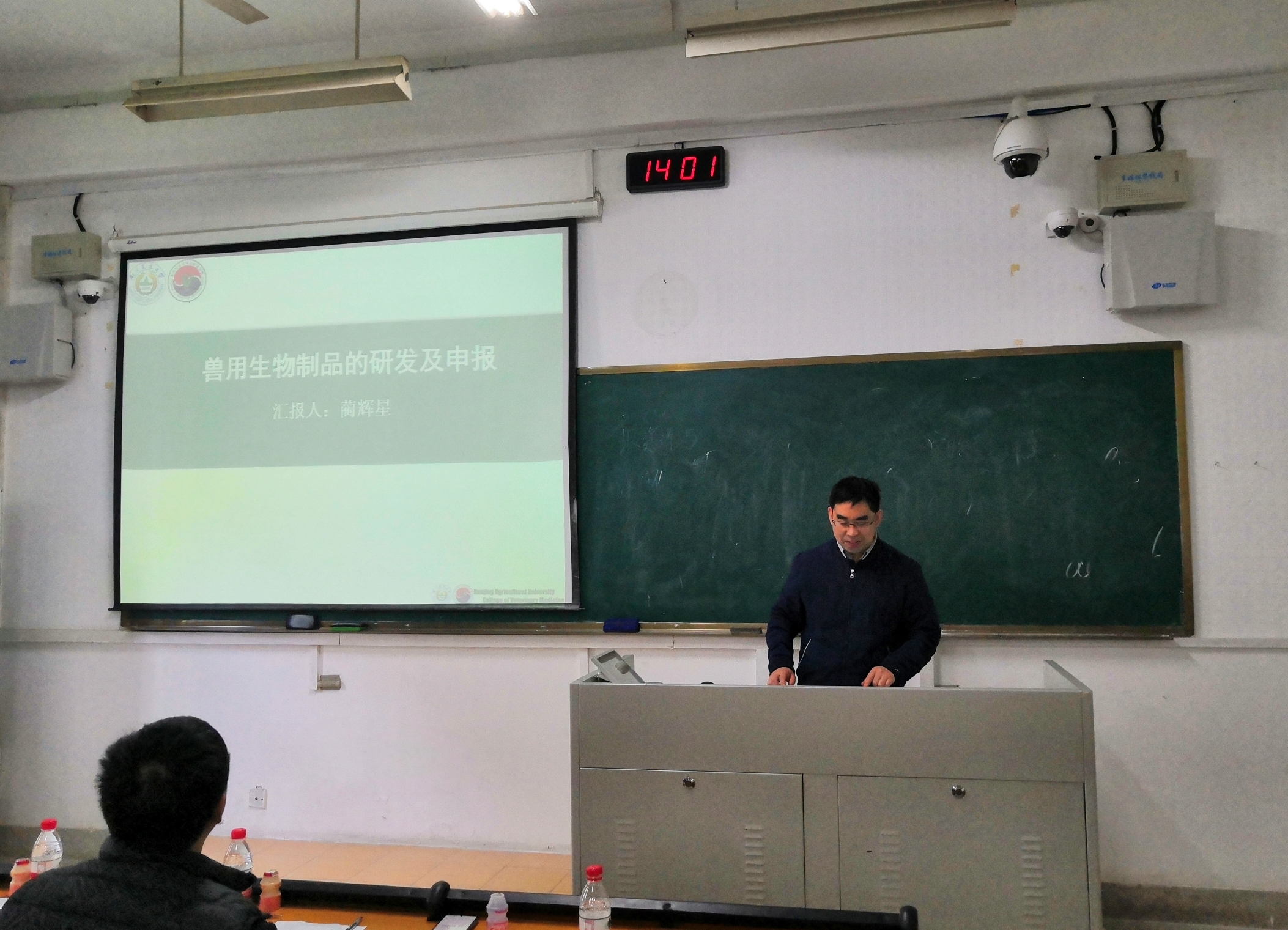 汇报题目为《兽用生物制品的研发及申报》。蔺老师从兽用生物制品的种类、政策法规、研发流程、注册申报流程、发展趋势5个方面进行详细阐述,其中重点介绍了兽用生物制品的研发流程和注册申报流程,拓展了同学们在生物制品领域的知识面,有助于今后将实验理论与生产实际结合,从而促进兽医行业发展。