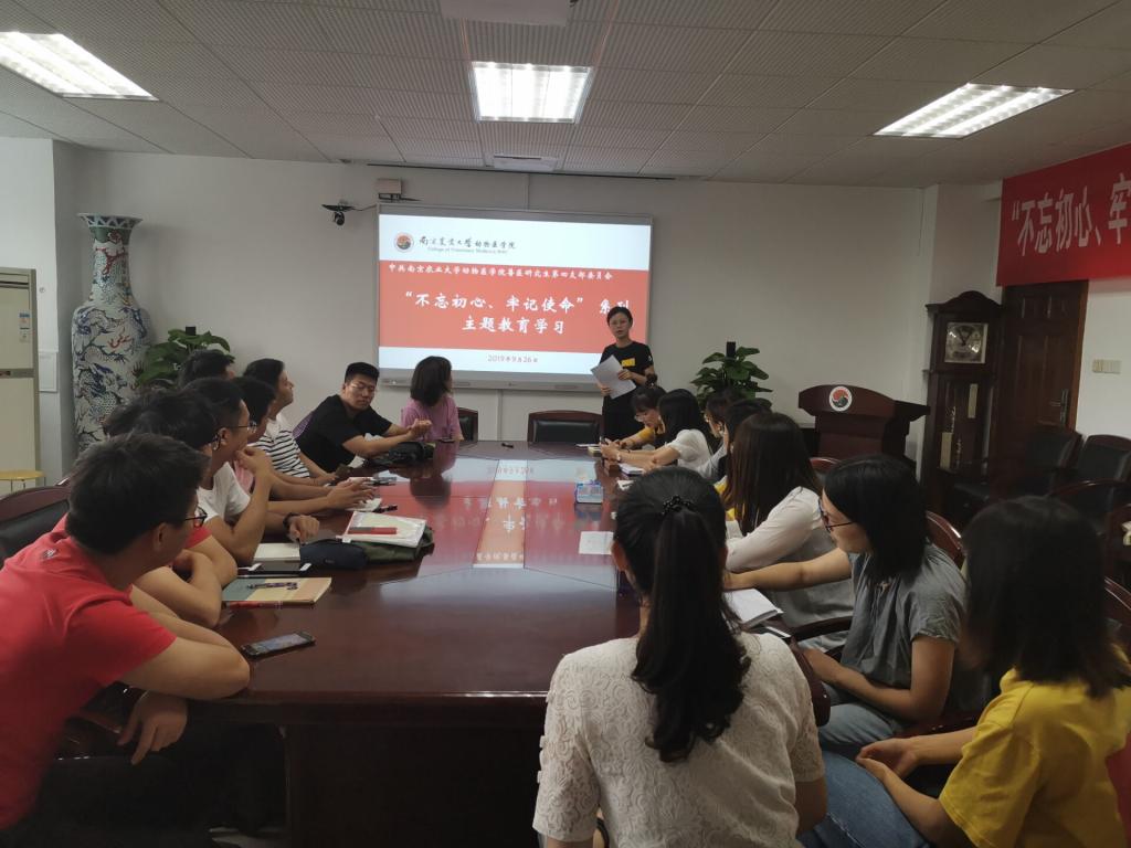 9月26日下午13:00,中共新葡的京集团8814兽医研究生第四支部委员会,在逸夫楼3036召开“不忘初心、牢记使命” 系列主题教育学习会。研究生专硕第四党支部全体党员到场参会。