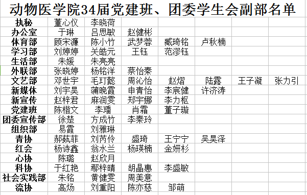 根据第34届党建班、团委学生会各部门的实际情况,以及调整原则:2017—2018秋季学期无挂科记录,累计GPA不得低于2.5,最终副部名单如下: