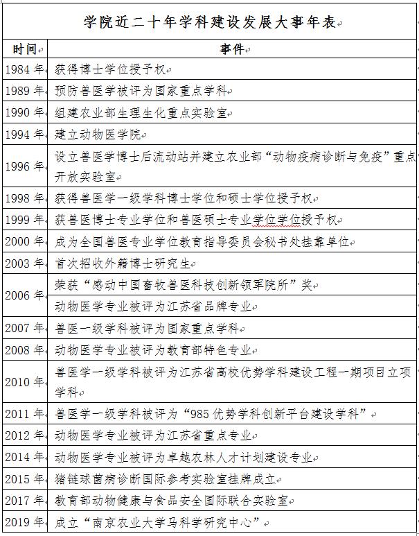 兽医学一级学科为国家重点学科,具有博士后流动站和一级学科博士点、硕士点;现为全国兽医专业学位教育指导委员会秘书处挂靠单位和副主任委员任职单位。建有动物科学类国家级教学示范中心、教育部动物健康与食品安全国际联合实验室、猪链球菌OIE国际参考实验室、农业部动物细菌学重点实验室、农业部动物生理生化重点实验室、江苏省动物免疫工程实验室等教学科研平台。动物医学专业2005年被评为江苏省品牌专业,2008年评为教育部特色专业,2012年被评为江苏省重点专业,2014年被评为卓越农林人才计划建设专业。教学成果突出,获国家教学成果二等奖1项、江苏省教学成果一等奖2项。